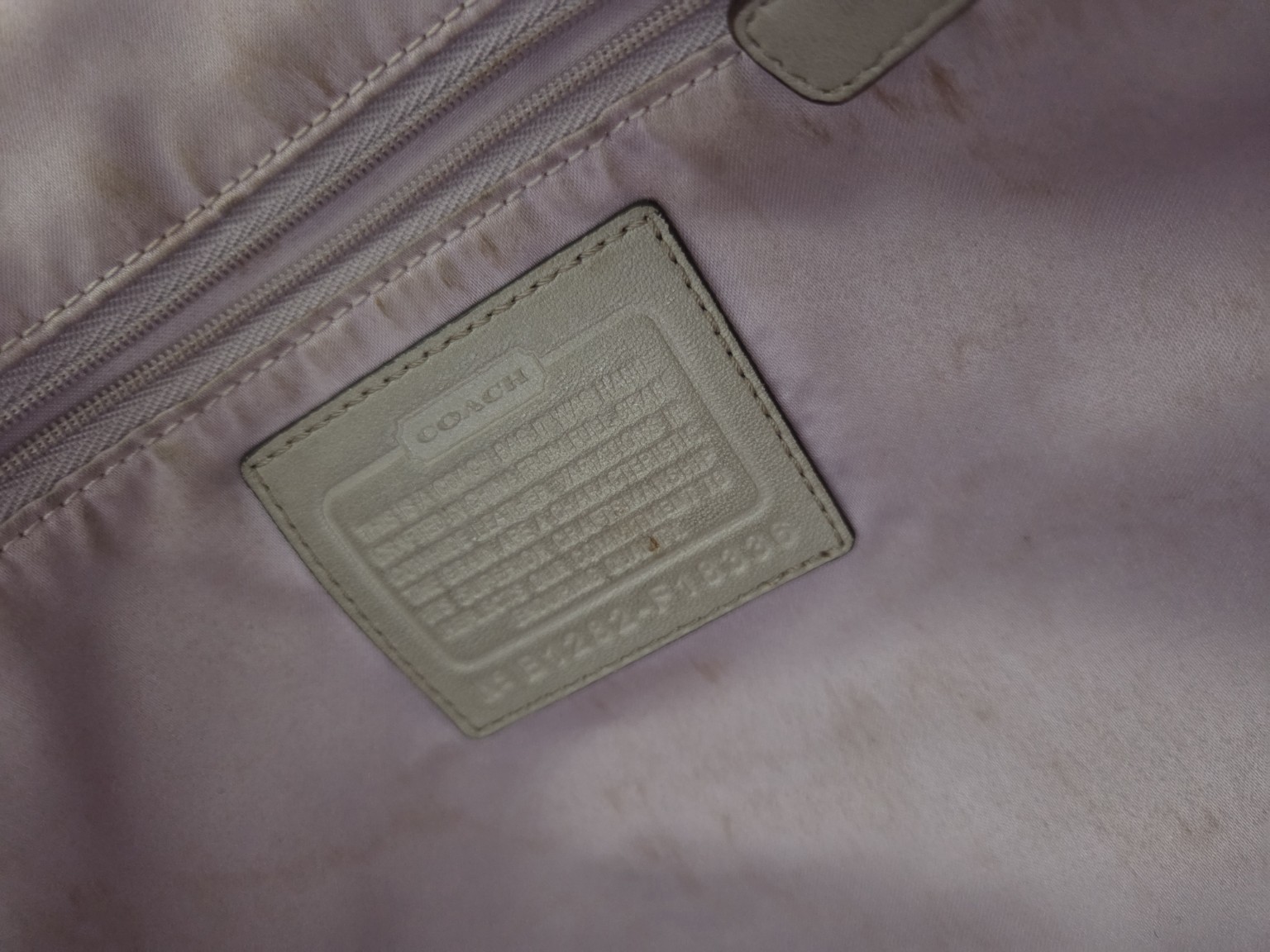 사진을 보시면 연보라색 안감 위쪽으로 갈색 얼룩들이 보이실 텐데요. 이건 제가 커피를 쏟은 게 아니라, 오래된 코치 가방들에서 종종 나타나는 현상이라고 합니다. (제작 당시 사용된 접착제가 세월이 흐르며 안감으로 배어 나오는 현상이라고 하네요.)