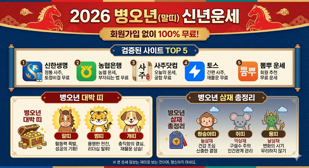#2026년신년운세 #2026년무료운세 #무료토정비결 #무료사주사이트 #신한생명무료운세 #농협무료운세 #회원가입없는무료운세 #병오년운세 #2026년삼재띠 #말띠운세 #대박띠 #점신 #아시아경제운세 #뽐뿌운세 #재물운 #신한라이프운세