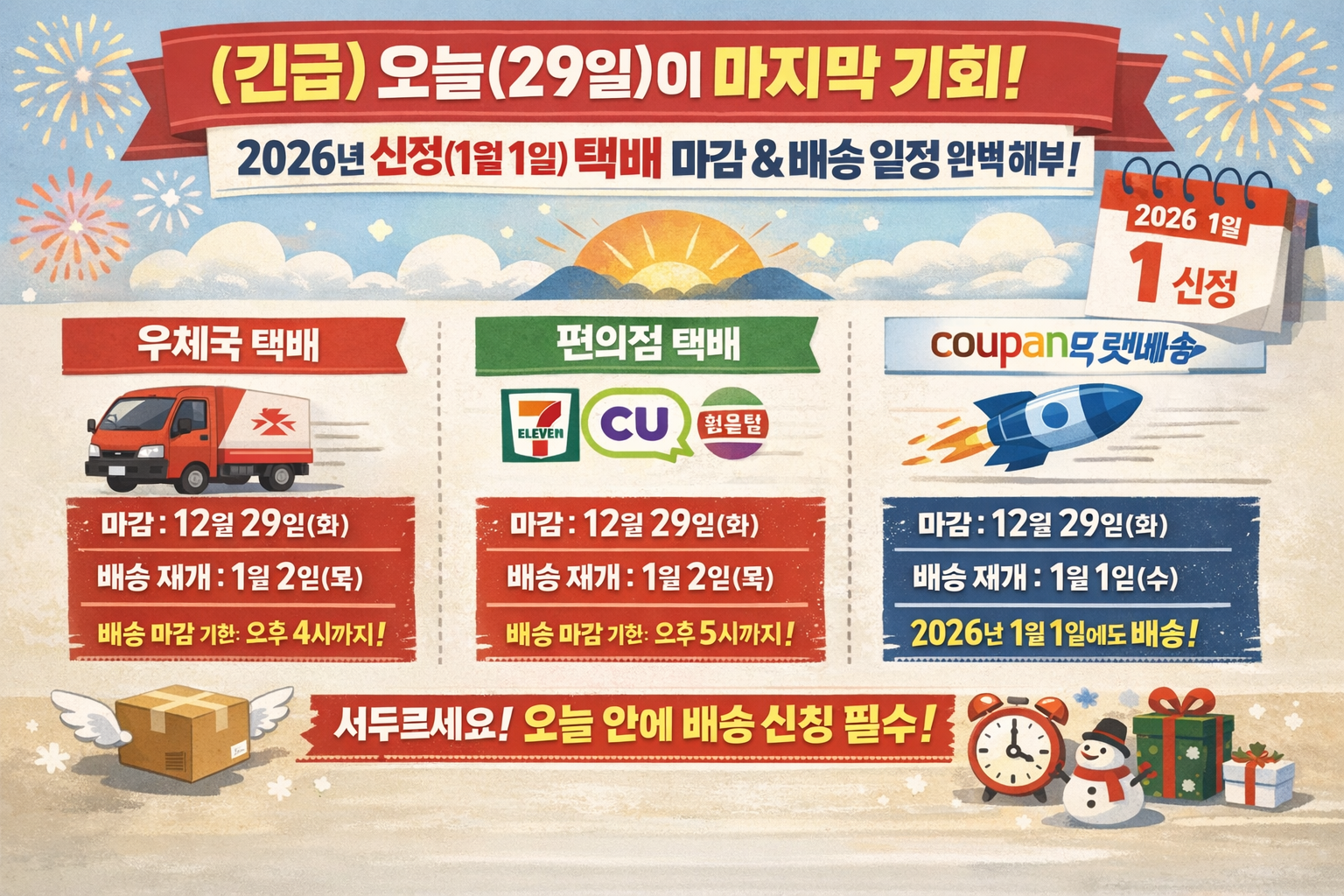 새해의 시작부터 배송 문제로 마음 졸이거나, 소중한 선물이 길바닥에서 새해를 맞이하는 일이 없도록 하려면 **오늘(29일)**이 정말 중요합니다.
