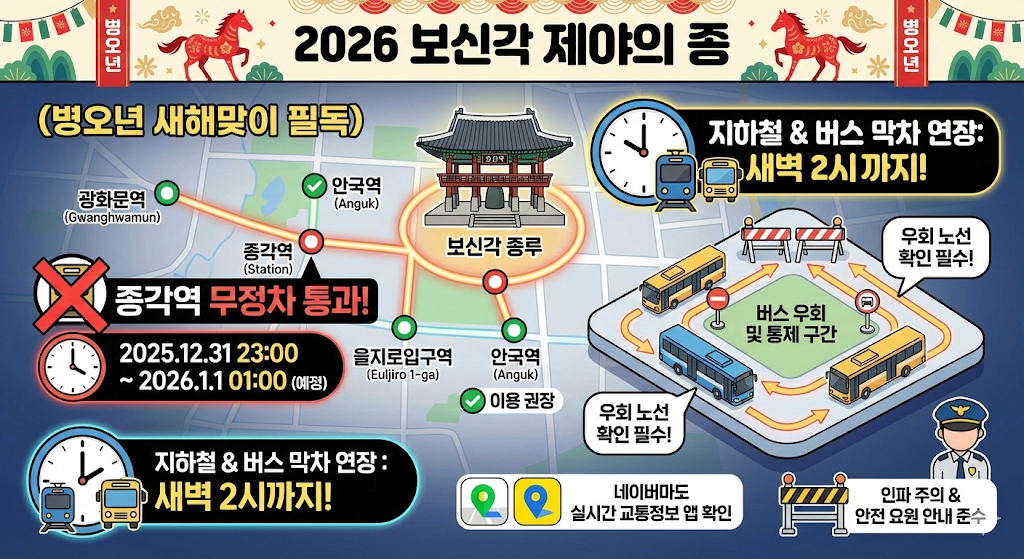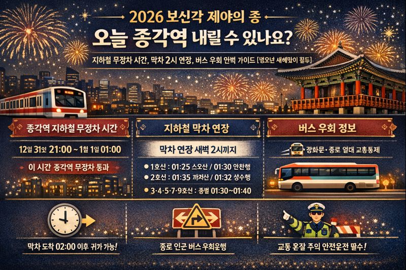 #2026제야의종 #보신각타종행사 #1월1일지하철연장 #종각역무정차시간 #보신각교통통제 #서울버스우회노선 #제야의종막차 #2026병오년 #새해맞이명소 #종로데이트 #광화문역 #을지로입구역 #심야버스 #올빼미버스 #서울시교통정보 #TOPIS #1호선막차 #제야의종화장실 #보신각꿀팁