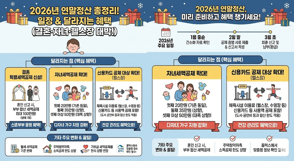 #2026연말정산 #2025년귀속연말정산 #연말정산일정 #연말정산달라지는점 #결혼세액공제 #자녀세액공제 #주택청약소득공제 #헬스장소득공제 #13월의월급 #국세청홈택스 #직장인꿀팁 #연말정산간소화서비스