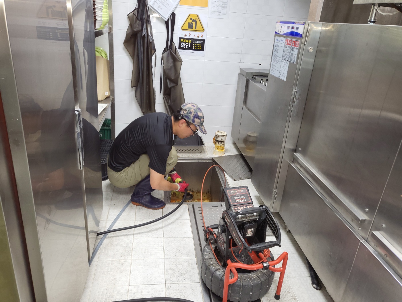 - 내시경 진단: 바닥 배관 3m 지점에 딱딱하게 굳은 유지방(기름) 덩어리 확인.