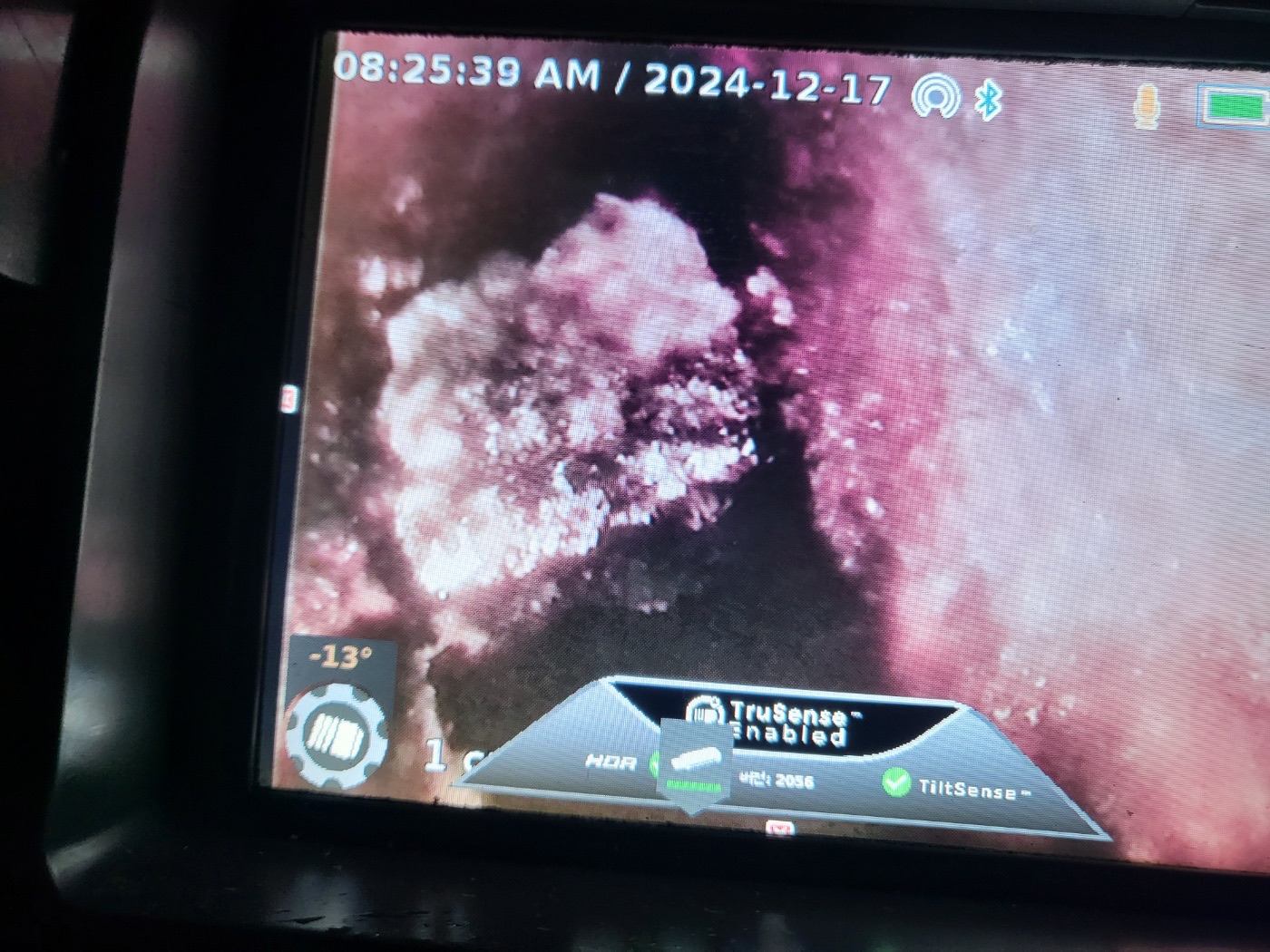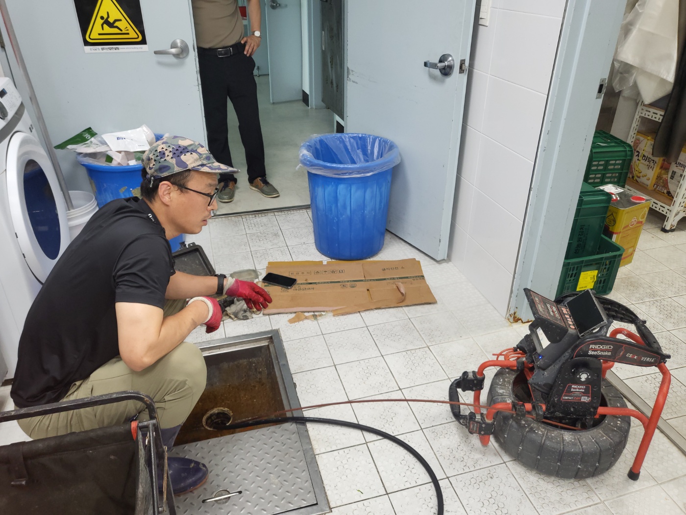 Step 1. 내시경 진단 바닥 배수구에 내시경을 넣어보니, 약 7m 지점(건물 외부로 나가는 구간)에 거대한 물티슈 뭉치와 기름 슬러지가 뒤엉켜 배관을 꽉 틀어막고 있었습니다.