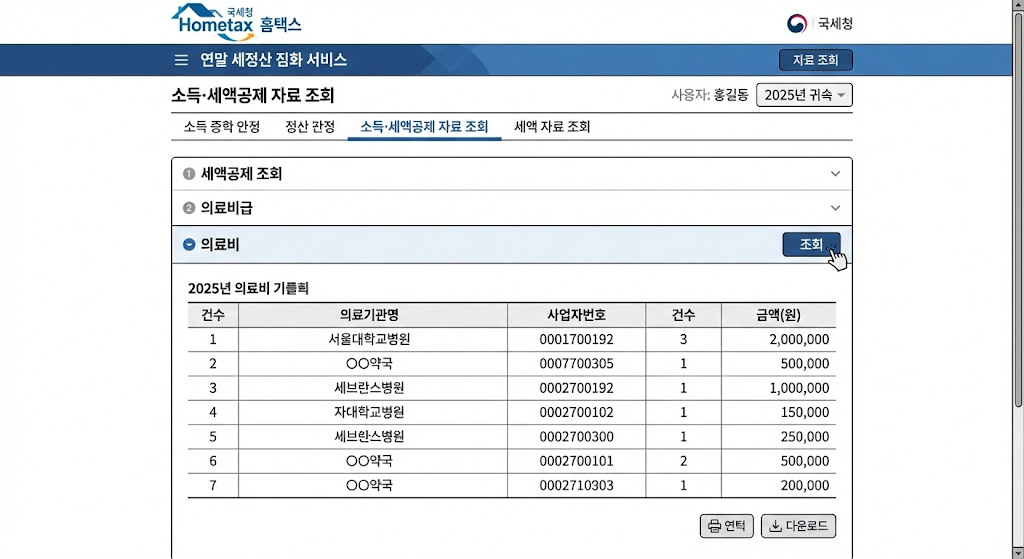 (이미지 : 홈택스 연말정산 간소화 서비스 '의료비' 항목 캡처 화면 / 국세청 연말정산 의료비 조회)
