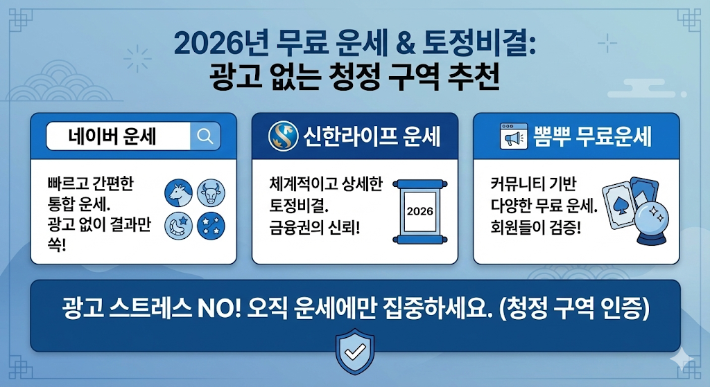 [2026년 무료 운세] 광고, 결제 유도 절대 없는 '청정' 토정비결 사이트 BEST 4 추천 (신한/농협/KB/삼성)