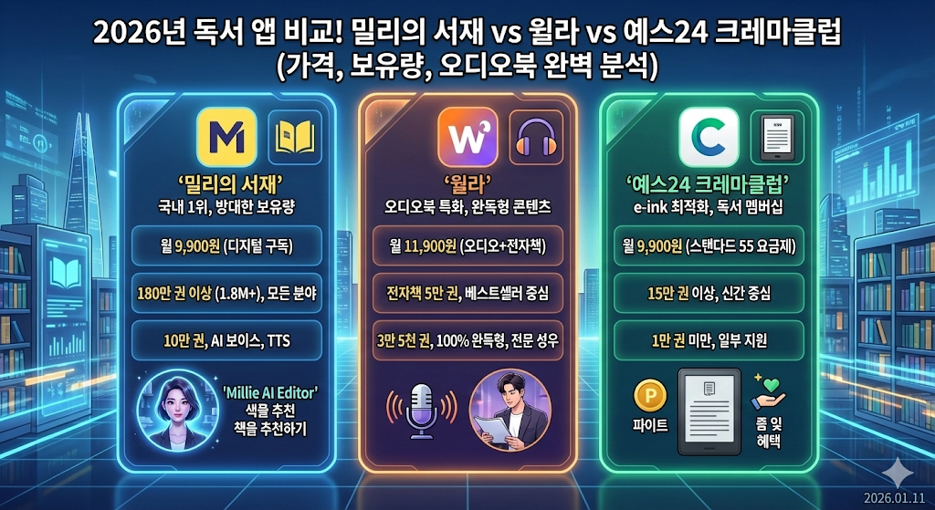 #2026독서앱추천 #밀리의서재가격 #윌라오디오북 #예스24크레마클럽 #전자책구독비교 #이북리더기 #오디오북추천 #새해목표독서 #독서어플비교 #밀리의서재윌라비교 #북클럽추천