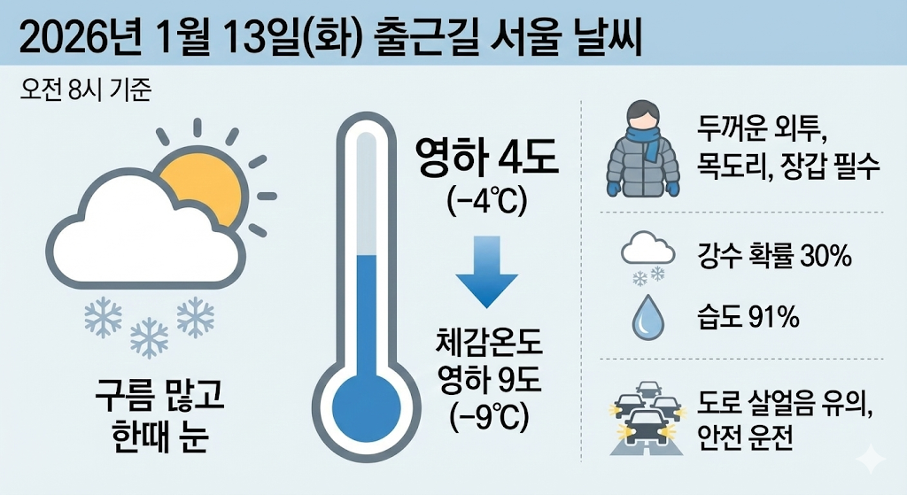 #내일날씨 #1월13일날씨 #출근길날씨 #서울영하9도 #내일눈소식 #빙판길주의 #블랙아이스 #미세먼지예보 #겨울철옷차림 #2026년날씨 #한파특보