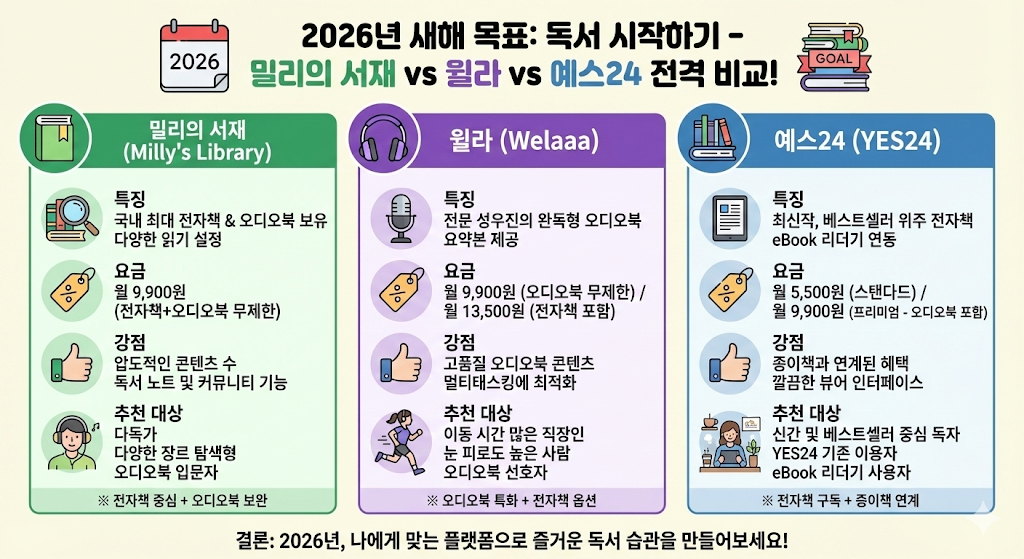 2026년 독서 앱 비교! 밀리의 서재 vs 윌라 vs 예스24 크레마클럽 (가격, 보유량, 오디오북 완벽 분석)