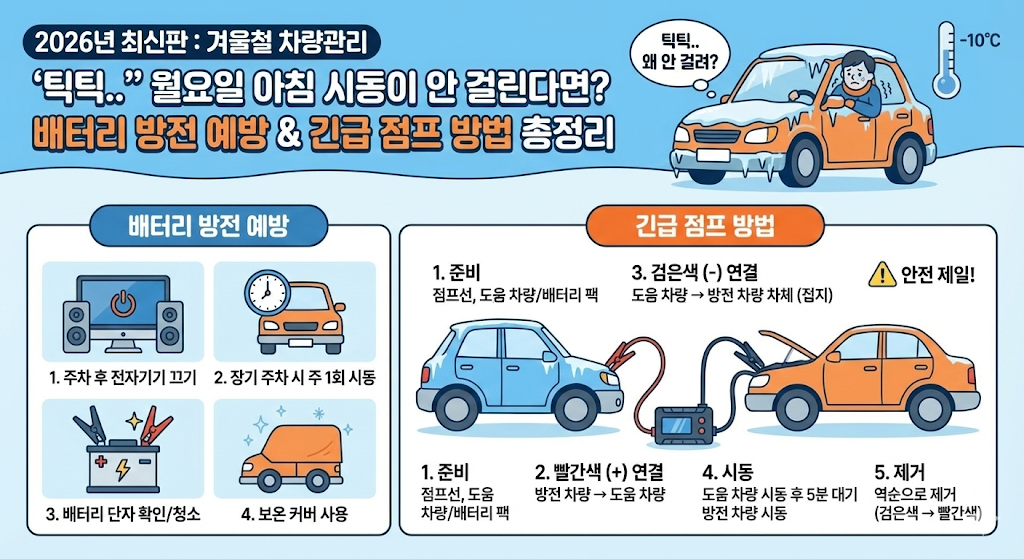 겨울철 차량관리 "틱틱.." 월요일 아침 시동이 안 걸린다면? 배터리 방전 예방 & 긴급 점프 방법 총정리 (2026년 최신판)