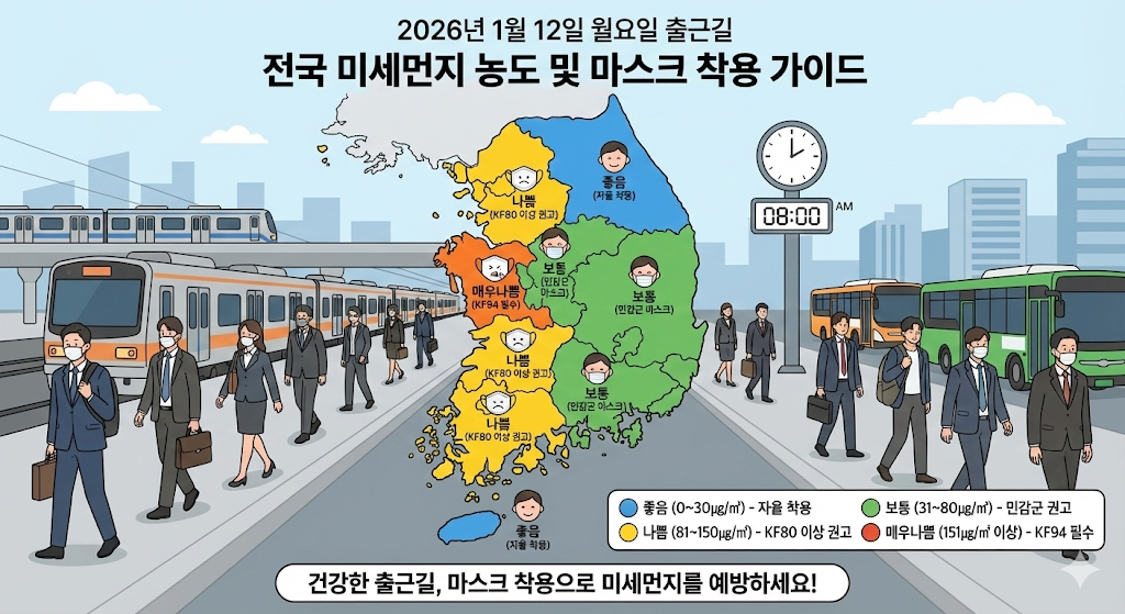1월 12일 월요일 출근길 비상! 전국 초미세먼지 '나쁨'… KF94 마스크 필수 (실시간 대기질 & 날씨)