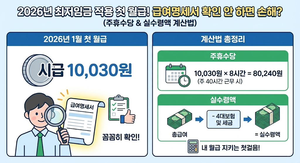2026 월급 최저임금 10,030원 적용 첫 월급! 급여명세서 확인 안 하면 손해? (주휴수당 & 실수령액 계산법)